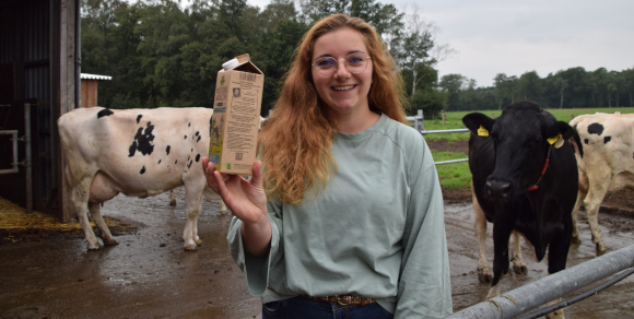 Jonna Sümpelmann wirbt auf der Michtüte fürs Tierwohllabel