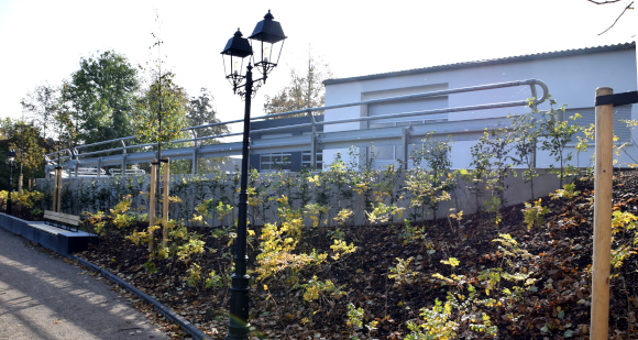 Der Bereich zwischen den beiden Mauern am Feuerwehrgerätehaus und unten am Teich, wurde mit Kartoffelrosen bepflanzt. Vor der oberen Hecke steht eine Buchenhecke die die karge Betonmauer verdecken wird. Auch einige Hainbuchen wurden gepflanzt. Die Vogelvoliere bleibt weiterhin Bestandteil dieses Bereiches und erhielt ebenfalls eine Bank, von der die Vögel gut zu beobachten sind. Die drei existierenden Leuchten wurden vom Teichufer zur Böschungskante/Mauer umgesetzt und auch an der Seufzerbrücke steht nun eine Lampe.