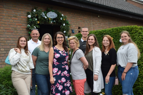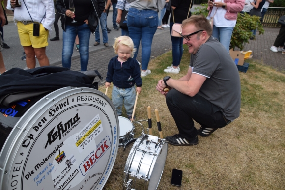 7.7.2022 Schermbeck (geg). Die Vorbereitungen fürs Traditionsfest laufen auf Hochtouren. Dem Königspaar einen Kranz zu binden gehört ebenfalls zu den Festaktivitäten. In der Schermbecker Gilde erhält das Königspaar im jährlichen Wechsel einen Kranz. In diesem Jahr war Königin Lenja Niesen an der Reihe. Da diese Reiterin ist, fühlten sich die Reitermädels samt Kompaniechef Michael Matuszczak bewogen, den Kranz und die Röschen zu binden. Da die Königinmutter Doris Hecheltjen-Niesen in diesem Jahr Goldkönigin ist, wurden auch einige goldenen Röschen am Kranz angebracht. Ein Ständchen brachte auch die Trommlergruppe, diesmal mit spontaner Verstärkung aus dem Tambourcorps Schermbeck.