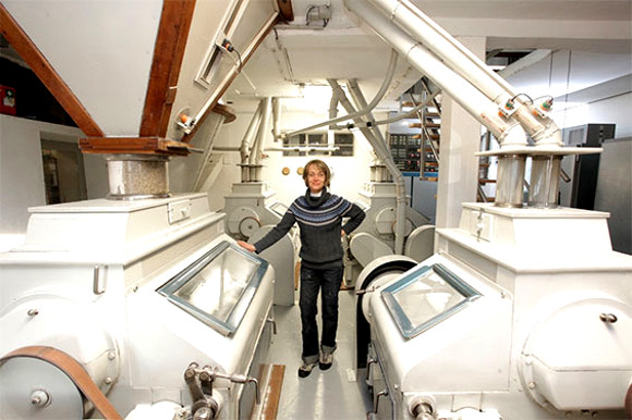 Im großen Raum neben dem Bioladen arbeiten mehrere Walzenstühle, zu denen lange Metallrohre aus der Decke hinführen. Immer wieder hält die Müllerin eine Hand in den feinen Schrotregen über den Walzen, um den Feinheitsgrad des Getreides zu zeigen, der hier gerade erreicht wird. Während die Hausherrin auf zig Transportwege deutet, die erst das Korn, dann Schrot und Gries und später das Mehl von einer Station zur anderen bringen, verlieren Besucher sofort den Überblick. Denn gemahlen, gesiebt und sortiert wird in einem halbautomatischen Prozess über drei Etagen und durch unzählige Rohre.
