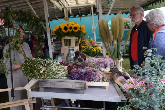 Schon am Eingang wurden die Flanierenden von einem großen Stand mit frischem Obst und Gemüse aus der Region empfangen. Gleich gegenüber gabs herbstliche Blumengrüße und Gestecke. Und natürlich das, was den Markt mit den 50 Ständen so besonders macht: Viel Handgemachtes. Wie bei Annegret Mitschker aus Gladbeck, mittlerweile eine Hobbykünstlerin wie sie erzählte. Sie präsentierte hübsches handgemaltes Geschirr. Die Schwestern Gabriele Schmidt und Barbara Mengel präsentierten "textiles Upcycling", wobei die eine mit Nadel und Faden arbeitet und die andere eher mit Strick- und Sticknadeln. Grüße aus dem nahen Kohlenpott gabs am Stand "Pot- Pourri" aus Wanne-Eickel. Hier wurden Handmade Artikel aus originalen Bergbaustoffen angeboten. Der Reitverein Gahlen war präsent und zeigte, dass die Mitglieder nicht nur das Reiten beherrschen. Auch Basteln und hübsche Dekorationsakrtikel herstellen, können sie. Diese wurden wieder zugunsten der Jugendabteilung verkauft. Und natürlich gabs jede Menge kulinarische Genüsse unter anderem Fisch, Griechisches, Panhas, Reibekuchen, nicht zu vergessen natürlich die leckeren Kuchen und Torten.