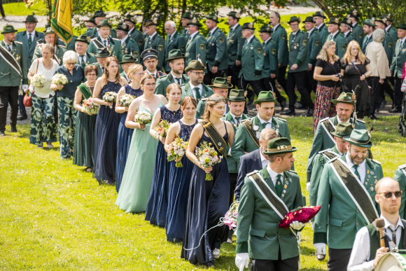 Die Zaungäste erfreuten sich an dem eindrucksvollen Bild auf der Festwiese, das sich schließlich nach dem Einzug präsentierte. Die Königspaare und Präsidenten, sowie die weiteren Ehrengäste nahmen auf einer Tribüne Platz.