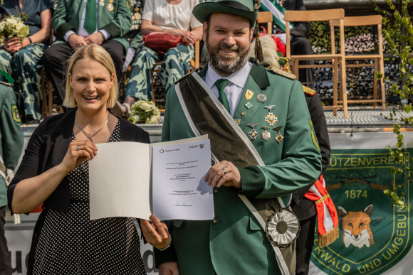 Die Landtagsabgeordnete Charlotte Quik würdigte in ihrer Ansprache die Verdienste des Vereines. „Seit dem Jahr 1874 hat sich vieles verändert aber eines ist geblieben: das gemeinsame friedliche feiern in Gemeinschaft und Freundschaft.“ Sie betonte, dass der ehrenamtliche Einsatz dafür nicht genug gewertschätzt werden kann. Aus diesem Grund überreichte sie dem Präsidenten Andreas Appenzeller die Ehrenplakette des Landes Nordrhein Westfalen. Auch Bürgermeister Mike Rexforth würdigte die Verdienste des Vereines und freute sich besonders darüber, dass die neue Festwiese realisiert werden konnte und damit auch die über 150-jährige Tradition weitergelebt werden könne.