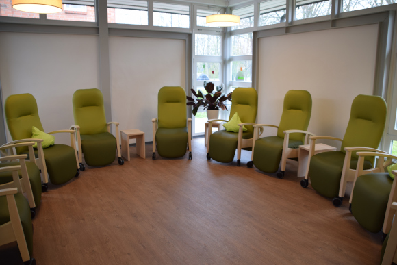 15 Personen am Tag können in der Einrichtung von 8.30 Uhr bis 15.30 Uhr betreut werden. Gestartet wird mit einem gemeinsamen Frühstück, dann wird die Zeitung gelesen, wobei die Pandemie und Kriegsberichte außen vor gelassen werden. Danach startet ein individuelles Programm aus leichter Gymnastik, gemeinsamen Singen oder einem gemeinsamen Spaziergang und vieles mehr. Nach dem Mittagessen in der hellen und dezent bunten Wohnküche, können sich die Gäste zum Mittagsschlaf zurückziehen, oder in den gemütlichen Sesseln ausruhen. Nach dem Kaffeetrinken ist noch Zeit für Gesellschaftsspiele, bevor die Damen und Herren wieder nach Hause fahren. Auf der Terrasse haben die Seniorinnen und Senioren die Möglichkeit Kontakt zur den Kindern der Kindertagesstätte im Haus aufzunehmen. Niermann erklärt, dass mehr wegen der Coronapandemie nicht möglich - aber der Kontakt über den Zaun doch recht herzlich sei.