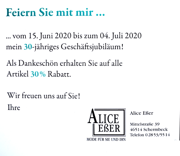 12.6.2020 Schermbeck (geg). Seit 30 Jahren findet die modebewusste Frau im Modehaus Alice Esser einen abwechslungsreichen und aktuellen Mix aus Klassikern und aktuellen Modetrends für die Kundin- für den Alltag oder fürs Büro.