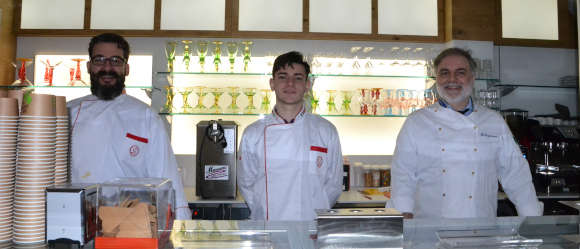 Im Eislabor arbeiten Maurizio Pagliarini und Davide de Florian derzeit an den 22 Eiskreationen, die dann pünktlich am Freitagmorgen darauf warten verzehrt zu werden. Die Produkte stammen von der Firma Prodotti Stella, die das „Gelato“ halbfertig liefert. Großen Wert legt der Lieferant dabei auf den Verzicht von Farbstoffen, Geschmacksverstärkern, Konservierungsstoffe und gehärteten Pflanzenfetten wie Palmöl, oder genetisch veränderte Zusatzstoffe, versichert Maurizio Pagliarini.