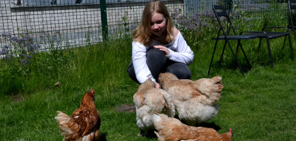 Greta erzählt, dass die drei geretteten Hühner wesentlich zahmer, als die aus der Züchtung sind. Sie lacht als sie berichtet, dass sie beim Stall reinigen immer aufpassen muss wo sie hintritt. Denn die Hühner, insbesondere Huhn Käthe, kuscheln sich an ihre Beine, suchen Körperkontakt.