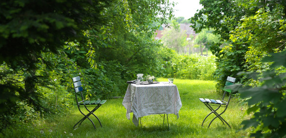 15.6.2021 Dämmerwald. Ein kleiner Tisch und zwei Stühle auf einer wilden Wiese in biologischer Artenvielfalt reichen der Kräuterpädagogin Jutta Becker-Ufermann zum Verweilen.