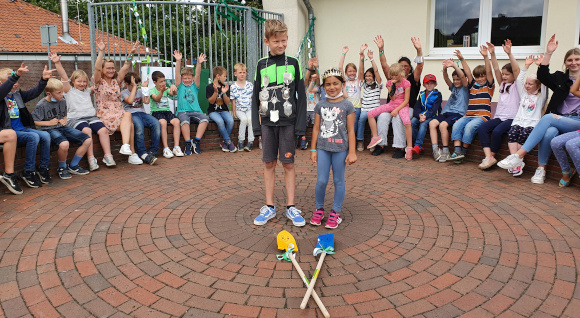 Mit der Tradition der Schüppenschützen setzten sich die Kinder am Mittwoch auseinander. Zwei Schüppen hatten die Jungen und Mädchen selbst gestaltet, mit denen der übliche Weitwurf in zwei Durchgängen stattfand. Dabei erzielten besonders die Jungen beachtliche Werte. Zu gewinnen gab es eine goldene Schüppe für den ersten Platz, die sich Mika Stricker mit erreichten 17,48Metern sicherte. Lian Schröter warf insgesamt 16,20Meter und erhielt die silberne Schüppe. Die bronzene Schüppe erhielt Jonas Scholz für seine geworfenen 15,10Meter.