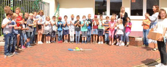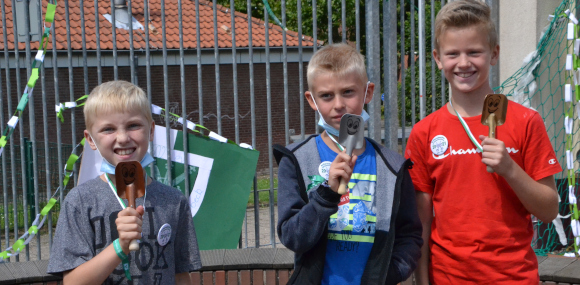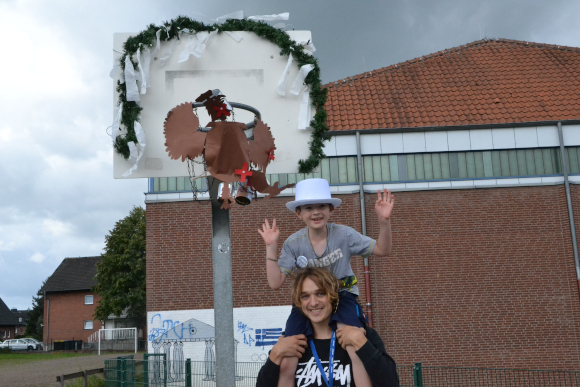 Alle weiteren Kinder erhielten eine kleine bunte Schüppe zum Umhängen und einen Button, den die Schüppenkompanie gespendet hatte. Ein weiterer Höhepunkt war natürlich das Königsschießen - pardon werfen. Von einem Pappvogel mussten fünf Körperteile abgeworfen werden. Simon Schüling bewies hier Treffsicherheit und hatte auch das nötige Quentchen Glück, um der erste Schützenkönig der OGS zu werden.