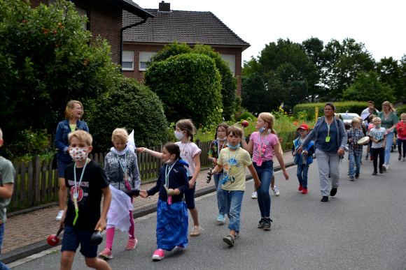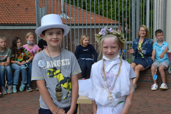 Auf den Schultern wurde er gehoben und ordentlich bejubelt. Simon erwählte sich Tiana Guth zur Königin. In einem fröhlichen Umzug zog die Festgesellschaft dann mit passender Schützenfestmusik, die einige Anlieger an die Fenster lockte, zum Caritas Kindergarten im Alten Rathaus. Hier ließen die OGS Kinder Bonbons auf die Kindergartenkinder herabregnen, die sich sichtlich darüber freuten.