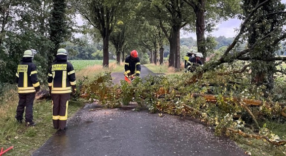 Allein auf dem Brüner Weg waren fünf Bäume umgestürzt. Insgesamt wurden weit über 20 Einsatzstellen abgearbeitet. Das kurze, dennoch heftige Unwetter, sorgte somit für reichlich Arbeit bei der Feuerwehr Schermbeck.