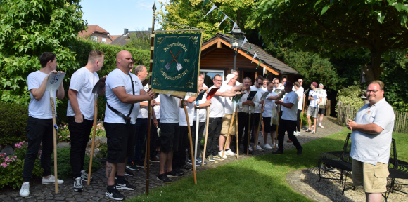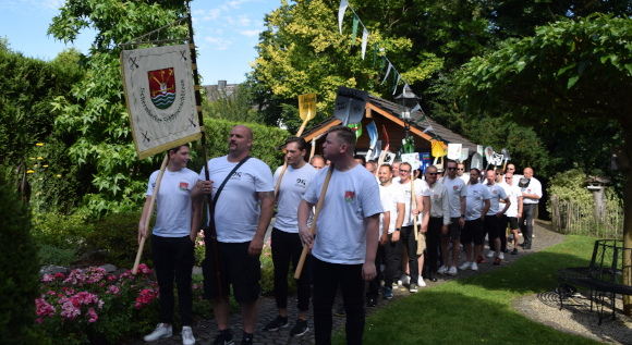Ein strammes Programm absolvierten die „Schüppenschützen“ der Kiliangilde Schermbeck am Samstag. Nach einem geselligen Nachmittag, zu dem der noch amtierende Schüppenkönig Matthias Müller eingeladen hatte, marschierten die Männer unter der Leitung von Schüppenkompaniechef Christian Hötting zum Bleichwall, um am Schießheim der Sportschützen Schermbeck, den frisch gebackenen Jungschützenkönig Peer Holtmann „Hoch leben“ zu lassen.