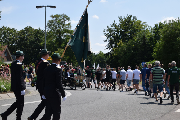 Unter dem Motto „Chaos, Zwieback und Stumpfsinn“ startete die Fähnchenschützengilde Buschhausen 1982 n.eV am Mittag in den Festtag. Bei herrlichen sommerlichen Temperaturen machte sich der Tross auf den drei Kilometer langen Marsch mit mehreren Haltepunkten. Tanken bei Roring, trinken am Hotel Zur Linde, noch ne Trinkpause bei Nappenfeld`s, fotografieren an der Kirche, trinken und rocken bei „O“. „Leyla“ erhielt den Wiederholungsmodus und schließlich ging es auf den langen Weg zum Festplatz, ganz am Ende des Kapellenweges. Zwischendurch noch schnell Pipi machen hinter der Brücke, eine erfrischende Dusche in der Fasselt`schen Waschstraße und ein Picknick mit geistigen Getränken bei Markus Fasselt. Musikalisch auf ihrem Marsch angetrieben, wurden die Schützen von „Best of Blaskapelle Einklang“, sowie dem Tambourcorps Schermbeck.
