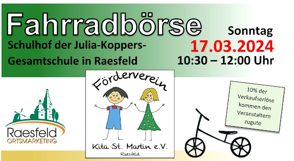 12.3.2024 Raesfeld. Der Förderverein der Kindertageseinrichtung St. Martin in Raesfeld veranstaltet die 14. Fahrradbörse in Kooperation mit dem Ortsmarketingverein Raesfeld.