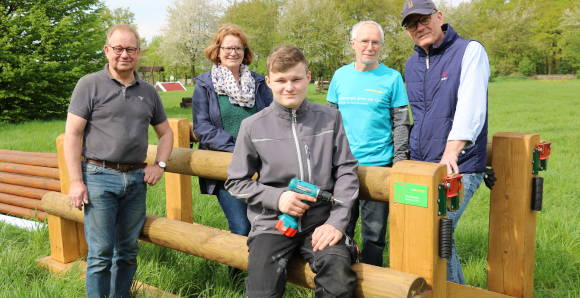 Der „Bautrupp“ des Reitvereins, so nennt Christiane Rittmann die fleißigen Helfer, hat die zwei neuen Hindernisse auf dem Gelände an der Hardtstraße in Dorsten kürzlich fertiggestellt. Georg Heger, zweiter Vorsitzender, Kassierer Georg Nachbarschulte und Lievert Nachbarschult waren fleißig, um Rainer Schikora von der Westenergie das Ergebnis zu präsentieren. Letzterer ist auch im Ruhestand noch unterwegs für das Programm „Aktiv vor Ort“ und stellt der Westenergie potenzielle Förderempfänger vor. „Eine wirklich sinnvolle Sache“, findet er.