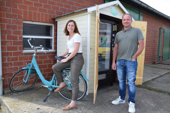 Die Hütte ist, wenn man die Einfahrt zum Hof hereinfährt, schon von weitem sichtbar. Kerstin Schweckhorst hat noch ihr Fahrrad geopfert, türkis angestrichen und dekorativ und quasi als „Wink mit dem Zaunpfahl“ neben die Hütte gestellt. Die Türen sind weit geöffnet, so dass der Blick direkt auf den Automaten fällt. Hinter dickem Panzerglas sind unterschiedliche Erfrischungsgetränke, Bier und für die Damen auch Piccolos im Angebot. Auch Süsskram für den kleinen Heißhunger zwischendurch kann dort aus dem Automaten gezogen werden. Für kleine Fahrradpannen oder Verletzungen gibt es Flickzeug und Pflaster. Was bisher am besten verkauft wird: „Cola und Duplo“, antwortet Tochter Leni wie aus der Pistole geschossen.