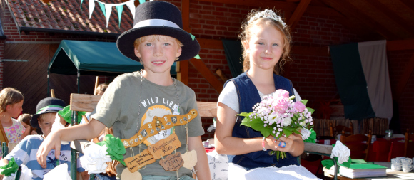 Alles war wie immer, die Hüpfburg stand parat, der Kaffeetisch war hübsch gedeckt und wartete auf die Gäste, die Kutsche war geschmückt, und der (Gemüse)Vogel, diesmal gebaut aus einer dicken Zucchini- wartete auf der Stange auf die Bewerber um die Königswürde. Doch zunächst drehte das amtierende Königspaar Marlen Schäfer und Lutz Hagedorn eine Runde auf dem Hof, um an der Vogelstange den ersten Wurf abzugeben. Geduld brauchten die kids in diesem Jahr - denn es brauchte 472 Schuss bis um 16.45 Uhr das Gemüse- nach einer entsprechenden Bearbeitung mit Werkzeug- aufgab und fiel. Denn alles entscheidenden Treffer landete schließlich der siebenjährige Henry Dieckhoff.