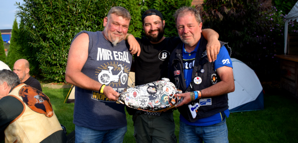 v.l. Dirk Hanke, Tim Lais und Udo Kolanczyk mit dem "Goldenen Tank" der Spendendose der Tour