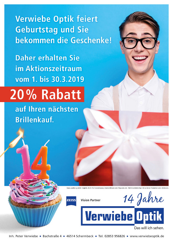 2.3.2019 Schermbeck. Vom 1. bis zum 30. 3. gewährt das Brillenfachgeschäft Verwiebe Optik 20 Prozent Geburtstagsrabatt auf den nächsten Brillenkauf.