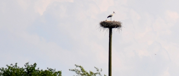18.6.2021 Gahlen. Vom Kuhweg aus waren, trotz der Entfernung, zwei winzige Köpfe im Storchennest zu erkennen. Mitten im Nest stand ein erwachsener Storch, der aber flugs das Weite suchte, als das Nest Besuch bekam und sich ein Raupensteiger näherte.
