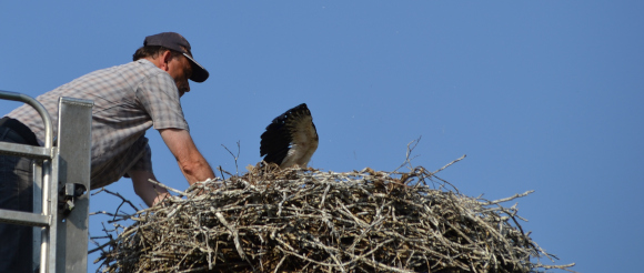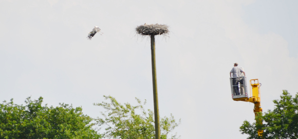 Ruhig ist es dort auf den Wiesen am Elsenweg, nur der Kibitz war zu hören und aus der Ferne ein bellender Hund. Der Jungstorch im Nest war zunächst gar nicht zu sehen. Nachdem Michael Jöbges hochgefahren war, versuchte er den Jungstorch mit ruhigen und langsamen Bewegungen zu greifen. Doch dieser war offensichtlich schon kurz davor flügge zu werden, wollte er doch ausreißen.