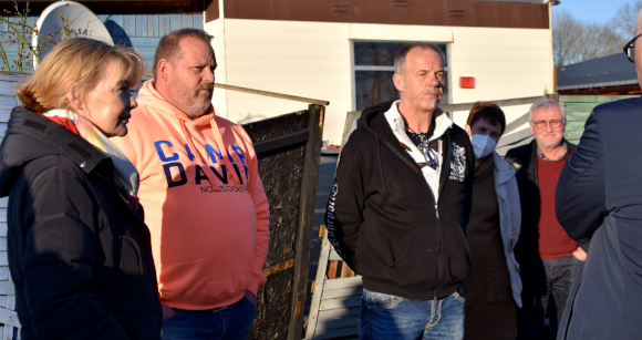 Entsetzt zeigten sich Rainer Keller und Kerstin Löwenstein über die Erzählungen von Monika Gichel, die ebenfalls zum Besuch der Politiker anwesend war. Beschimpft worden wäre sie von einem Mitarbeiter des Kreises Wesel, der ihr gesagt habe, dass sie den Hund abschaffen und arbeiten gehen solle, dann bräuchte sie auch die Grundsicherung nicht, könne ja in eine Notunterkunft gehen. Monika Gichel lebte 20 Jahre auf dem Platz, ist Rentnerin und bezog bis zum 28.2. zusätzlich zur schmalen Rente, die zum Leben nicht ausreicht, eine Grundsicherung. „Ich hab noch 37 Euro, die Unterstützung ist mir komplett gestrichen worden, weil ich auf dem Campingplatz nicht mehr wohnen darf“, berichtete sie. Keller zeigte sich schockiert, wollte gar nicht glauben, was er hörte und sagte: “Ich finde das hochgradig traurig, das muss geklärt werden“. Und. “So geht man nicht mit Menschen um.“