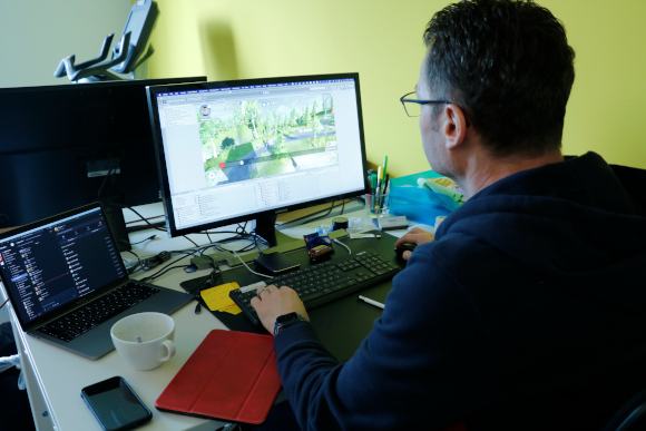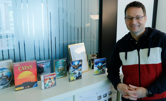 Stellt man sich einen Spieleentwickler vor, denkt man zunächst an einen echten „Nerd“: hängt 24 Stunden vor dem PC, raucht eine Zigarette nach der anderen, trinkt literweise Kaffee oder Energydrings. Doch weit gefehlt: „Energydrinks habe ich zuletzt während meines Studiums getrunken“, lacht der 54-Jährige. Vielmehr brennt er für seinen Beruf, bringt allerdings allerhand andere Tätigkeiten noch unter einen Hut. Unterhält man sich mit ihm, möchte man meinen, sein Tag hätte noch deutlich mehr als 24 Stunden.
