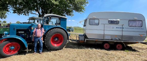 Nun hat es ihn nach zwei Tagen Fahrt auch in das beschauliche Gahlen verschlagen, um seinen Trecker samt Wohnwagen auf dem „Tennenfest“ vorzuführen. Er schläft nämlich keinesfalls in Hotels, sondern in seiner mitgebrachten Unterkunft auf Campingplätzen. Am liebsten solche, auf denen er seine Ruhe hat, betont er.