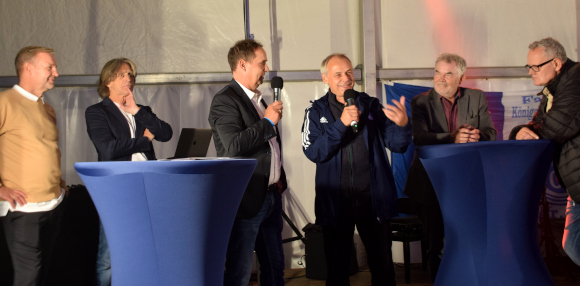 In einer kleinen Talkrunde, die von Dirk Szczepaniak moderiert wurde, berichteten Mike Rexforth, Norbert Elgert, Manni Breuckmann, Klaus Fischer, Olaf Thon und Uli Potofski unter anderem auch von ihren Highlights, an die sie sich im Zusammenhang mit Schalke 04 erinnern. Für Rexforth war es ein Autogramm von Norbert Elgert. „Dieser wohnte in der Ludgerusstraße, ich bin als circa Neunjähriger mit dem Fahrrad und nem Köttel in der Hose hin, hab geklingelt und um ein Autogramm gebeten“, erzählte er. Der besondere Derbymoment des Sportmoderators Potofskis fand beim Revierderby im Jahr 1966 statt. Die Dortmunder gewannen das mit 3:2, aber: “Ich habe kein einziges Tor gesehen, da das Stadion im Nebel lag“. Unvergessen bleibt für Breuckmann der Sieg der Schalker über Dortmund im Jahr 1993. Als Mulder das 1:0 schoss, habe er vor lauter Euphorie und Freude die neben ihm sitzende Kollegin Susanne geküsst. Und die küsst er auch heute noch, denn sie wurde seine Frau. Für Klaus Fischer war es das ärgerliche Ereignis im Jahr 1977, das er nannte, als die Schalker trotz des Sieges über Dortmund am Meistertitel vorbeischrappten.