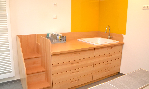 Hell und freundlich erstrahlt das neue Badezimmer jetzt im warmen weiß mit grasgrünen Accessoires. Der große und funktionale Wickeltisch bietet mit seinen großen Schubladen viel Platz, um benötigte Dinge zu verstauen. Größere Kinder müssen nicht mehr hochgehoben werden, sondern sie können den Tisch über eine Treppe selbst erklimmen.