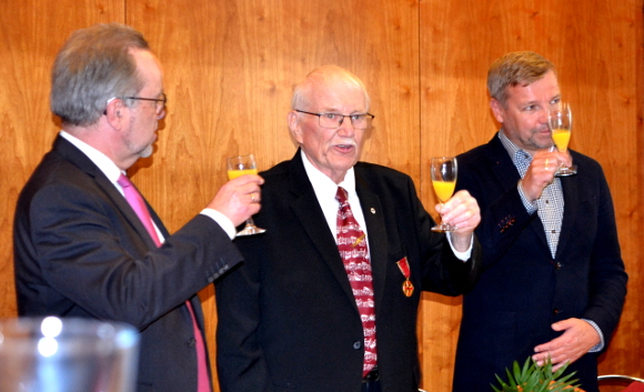 Kurz nahm der Würdenträger noch Bezug auf seine Krankheit, wegen der der ursprüngliche Termin der Verleihung verschoben werden musste. „Ich würde lügen wenn ich sagen würde, dass es mir gut geht“. Aber „Ich hoffe dass ich bald wieder aktiv werden kann“. Ganz besonders bedankte er sich bei seiner Familie und seinem Neffen Ralf, der für ihn da sei, der ihn jeden Tag in Münster in der Klinik besucht habe, an die Weggefährten die ihm geschrieben und ebenfalls besucht hätten. „Es tut gut, wenn man diese Zuwendung bekommt, das hilft einem sehr“, so Gerd Becks.