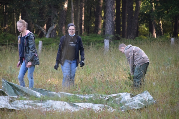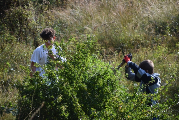 Justine, Mia und Jolina haben beim Entfernen der kleinen Kiefern zwischen der Heide, schon ganz viel Spinnen, Teichmolche, Nacktschnecken und Grashüpfer entdeckt und sind begeistert. „Das ist hier auch eine sportliche Betätigung und macht unglaublich viel Spaß, wir sind gern dabei“, erzählen die Mädels und würden das auch gern ein- bis zweimal im Jahr wiederholen. Außerdem sei es auch cool den Lebensraum der seltenen Tiere zu schützen. Unerwähnt lassen sie natürlich auch nicht, dass endlich mal im Unterricht ohne Ende gequatscht und gelacht werden kann. Andere Schüler entfernen mit Sägen an einem Hang wild wachsende Zweige und auch kleine Kiefern und Birkenbäumchen.