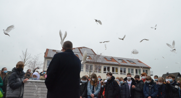 Am letzten Dienstag, 15.03. hat in der der 2. großen Pause auf dem Schulhof eine „Andacht für den Frieden“ mit allen Schülerinnen und Schülern und dem gesamten Kollegium stattgefunden. Vorbereitet wurde diese Andacht von der Fachkonferenz Religion und geleitet von Diakon Karl Haßlinghaus von St. Ludgerus und Pfarrer Hans Herzog von der evangelischen Kirchengemeinde Schermbeck. Während der Andacht, die von dem Friedensgebet von Franz von Assisi eingeleitet wurde, stiegen weiße Friedenstauben auf. Fürbitten und Gedichte der Jahrgänge 5, 10 und Q2 mit dem Wunsch nach Frieden wurden vorgetragen. Den Schluss bildete das von allen gemeinsam gesungene Lied "Imagine" von den Beatles