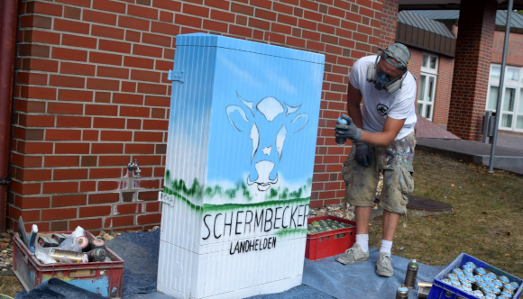 Begrüßt wurden die Gäste von Marcell Oppenberg, dem Vorsitzenden der „Schermbecker Landhelden“ und Sabrina Greiwe, (Landhelden und Wirtschaftsförderung). Oppenberg betonte seine Freude über das Gelingen der Aktion. Immerhin haben nun 33 von 200 Kästen ein freundlichen „Outfit“ – sind zu echten Hinguckern geworden. So verewigten die Fähnchenschützen ihren „Heiligen Suppsack“ am Stromkasten vor der Kiliansapotheke und wollen auch in Buschhausen noch weitere zwei Kästen verschönern. Die Gesamtschüler malten ein van Gogh Motiv an der Schlossstraße. Die Schüler des Teilstandortes der Gemeinschaftsgrundschule verewigten ihre Hände auf insgesamt drei Kästen. Natürlich in fröhlich bunt. Andrea Sterner holte den Dammer Turm auf die Mittelstraße. Die Dammer Studentin Jasmin Limberg nahm für die Landfrauen den Pinsel in die Hand und verewigte die Dammer Mühle. Über dem Turm fliegen Bienen, denn die Biene ist das Logo der LandFrauen.