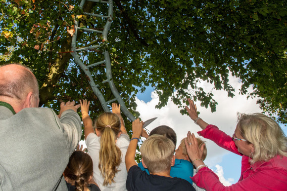 Zu den Lieblingsplätzen der meisten Kinder zählt die Himmelsleiter – die Station, wo sich Himmel und Erde auch optisch miteinander verbinden. Die lange Leiter aus Naturästen hoch oben im Baum kann zwar aus Sicherheitsgründen nicht mit den Füßen, wohl aber mit dem Blick bestiegen werden. „Wenn ich darunter stehe und bis oben zur Spitze gucke, fühle ich mich richtig frei“, beschreibt Luise das Gefühl. An der St.-Marien-Kirche wartet auf die Kinder schließlich ein eigener Kinder-Pilger-Weg-Stempel für ihren Pass, bevor der Weg in der Gnadenkapelle, dem Ort des Gebets, endet. „Hier können sie eine Kerze entzünden und das vom Kinder-Pilger-Club selbst geschriebene Kinder-Pilger-Gebet mitnehmen“, sagt Petra Maria Wewering.