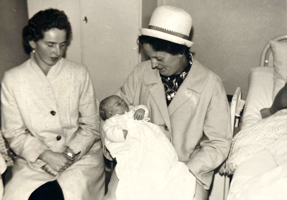 Das Foto zeigt Petra Becker mit ihren Taufpatinnen am Wöchnerinnenbett ihrer Mutter