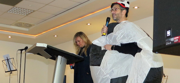 Selbsternannter „Fußballlegastheniker“ Christoph Droste erinnerte an die „Auswärtsspiele“, die Abschlussfahrten, die für die 10. Klassen und auch ihre Klassenlehrer ein besonderes Highlight darstellten. Bundestrainerin Wibke Klees stellte fest, dass die „Trainingszeiten“ weitestgehend eingehalten wurden, auch wenn die ein oder andere Verspätung mit solch kreativen Ausreden wie einem Besuch zum Bäcker oder Friseur gerechtfertigt wurden. Nur selten gab es Ärger mit dem „Vereinsvorstand“ und nur einmal musste die Startelf durch den „Stadionlautsprecher“, eine Durchsage, ausgerufen werden. Besonders stolz waren Droste und Klees über die Unterstützung der Fans, der Eltern und Familienangehörigen, ohne deren Hilfe dieser Mannschaftssieg wesentlich schwerer gewesen wäre.