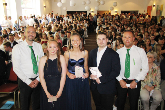 24.6.2024 Mit lauter Musik und noch lauterem Applaus wurden die Zehntklässlerinnen und Zehntklässler der Gesamtschule Schermbeck entlassen. Beim Festakt im Ramirez konnten die 10. Klassen mit ihren Eltern, Lehrerinnen und Lehrern auf sechs ereignisreiche Jahre an der Gesamtschule zurückblicken und diesen Meilenstein in ihrer Schullaufbahn gebührend feiern. 91 Schülerinnen und Schüler erwarben einen mittleren Schulabschluss mit der Berechtigung, die Oberstufe zu besuchen. 10 von ihnen können auf Grund ihrer überragenden Leistungen direkt in der Q1 starten. Wie vielseitig die Bildungsabschlüsse an der Gesamtschule sein können, zeigt ein Blick auf die Jahrgangsstatistik. 29 Schülerinnen und Schüler erwarben einen normalen mittleren Schulabschluss, 22 einen Erweiterten Ersten Schulabschluss und alle anderen einen Ersten Schulabschluss