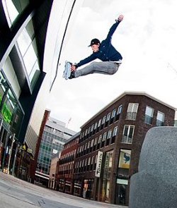 Jan Ebbert hat, bevor ihn das Fieber packte, zunächst erstmal acht Jahre Fußball gespielt. In Erle am Jugendhaus schrottete er damals mit seinen anfänglichen Sprüngen und Grinds die ersten Fitnessskates, berichtet er lachend, denn „Die hielten die Sprünge nicht lange aus". Er wurde zum „Agressiv Skater" schuf sich Rollerblades an und von da an ging die Post ab. Ohne Schutzkleidung. Jan winkt ab: „Wenn man ein paar mal hingefallen ist, dann weiß man wie man fallen muss" ist er überzeugt. Eine einzige Ausnahme gebe es: „Bei Contests trage ich einen Helm, denn das ist mit den vielen Teilnehmern zu unübersichtlich".