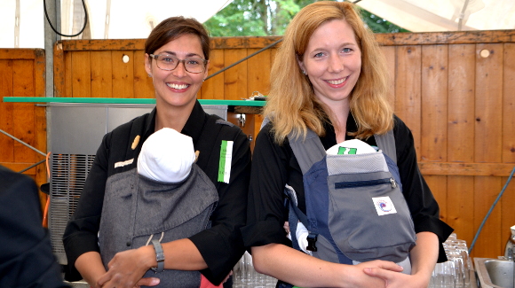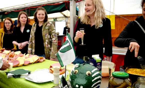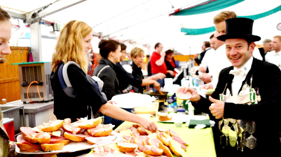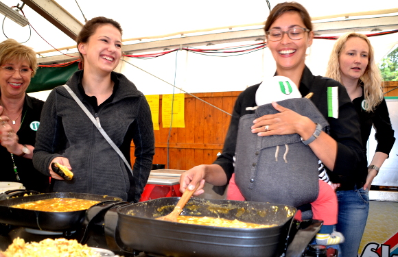 Neben der viereinhalb Monate alten Sophie und dem fünf Monate alten Johann, die im Tragetuch die "Frühstücksarbeit" verschliefen, war auch Bürgermeister Mike Rexforth zugegen. Doch bevor er herzhaft ins Brötchen biss, griff er zum Messer um den Damen zu helfen. Dafür stellte er sich den Wecker extra auf zehn vor sieben, berichtete er mit etwas angeschlagener Stimme, um dann um acht Uhr den Damen zur Seite zu stehen. 230 Brötchen und 400 Eier wurden weggefuttert.