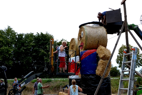 Vier Stunden dauerte es, bis die vielen fleißigen Hände das (sturmsichere) Königspaar aus Stroh gebaut hatten. Die Details wie zum Beispiel Krone, Pfeife oder Augen brachte das amtierende Königspaar selbst an und stieg dafür auch in einen Hubsteiger. Anwesend waren das Silberkönigspaar Heinz Temmler und Mechtild Schick, sowie die Goldkönigin Cilly Deiters.