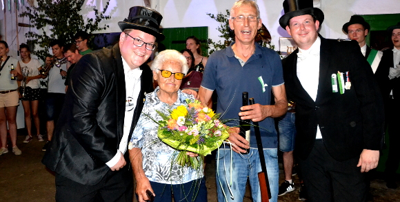 Mitten drin im Trubel natürlich auch Hofbesitzerin Adele Cluse, die ein großes Dankeschön und einen Blumenstrauß erhielt, weil sie in jedem Jahr Haus und Hof fürs Fest zur Verfügung stellt. Sie selbst ist ein großer Fan der Fähnchenschützen und war bis nach Mitternacht auf der Deele zu sehen.