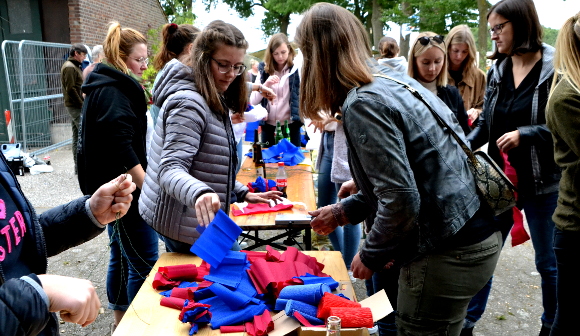Denn der riesige Bogen über dem Schulweg wird in jedem Jahr von der Jugendtanzgruppe gebunden, aufgestellt und geschmückt. Damit die Arbeiten auch wie geölt vonstatten gehen, spendieren die Uefter Junggesellen in jedem Jahr die Getränke dazu. Unterstützung erhalten die jungen Leute zwischen 14 und 33 Jahren von der Firma BWR die die Fundamente und Gerätschaften zur Verfügung stellt. Familie Knufmann spendiert das Stroh. Und auch hier zeigte sich, Das Kranz binden ist Männersache, das Röschen binden und schmücken Frauensache.