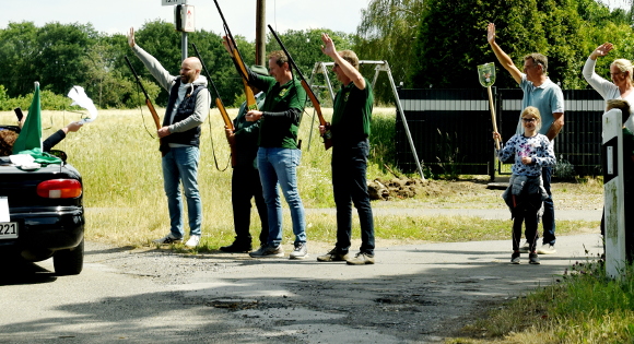 Vielleicht haben ja auch einige verdrängt, dass das Fest wegen der Coronapandemie ausfällt und wollten zur üblichen sonntäglichen Parade. Aber: Die Festwiese blieb natürlich verwaist. Dafür kamen die Thronpaare Ulla Schulte, Gerd Pleines Silke Terhart und Dietmar Sadlo mit ihrem Königpaar Königin Anke Rohe, König Ingo Wengel via Cabrio angefahren. Die Teilnahme an der Kranzniederlegung stand bei ihnen auf dem Programm und dann mit den Cabrios eine Tour durch Damm cruisen. Im Kofferraum hatten sie reichlich hochgeistige Nahrung in kleinen Fläschchen, sowie Süßkram für Kinder. An vielen Straßenecken wurde der Tross erwartet und fröhlich begrüßt. Nach einem kurzen Stopp ging es weiter, denn der Thron musste oftmals halten.
