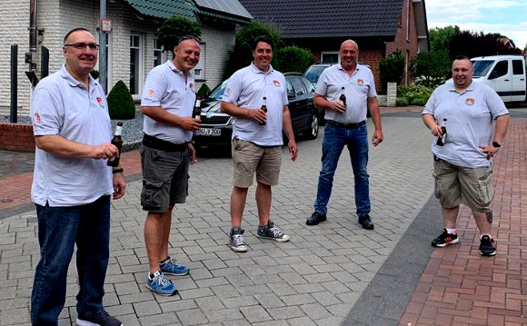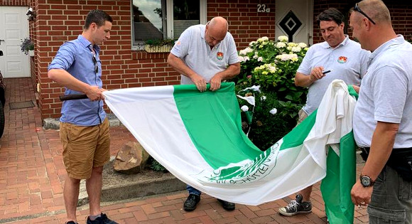 2.7.2020 Schermbeck (geg). Am Samstag fuhr eine Abordnung der Kiliangilde samt Kaiser Sven Nuyken nach Ahaus, um den dorthin verzogenen Goldkönig 2020 mit einer Kiliansfahne zu versorgen.