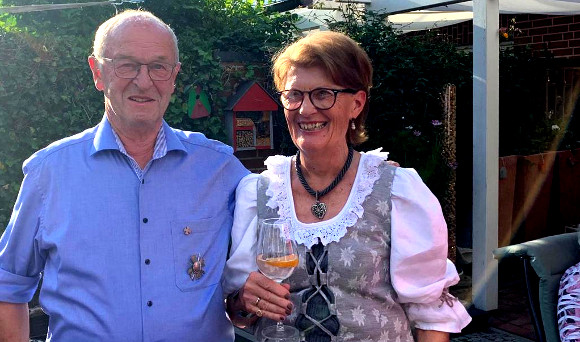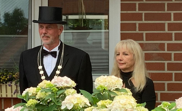 Denn nach dem Klingeln öffnete ihnen nicht nur das Ehepaar Verwaayen, sondern der gesamte ehemalige Thron mit Goldkönig Heinz Verwaayen, Goldkönigin Ludgera Krass, sowie den Ehrendamen Burgis Berg, Elsbeh Lensing und Marlies Verwaayen. Ehrenherren gab es damals noch nicht, so dass der König sich nicht nur mit der Königskette, sondern auch mit vier Damen schmückte.