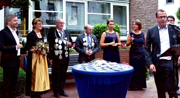 Der Vorstand hatte auf den Platz vor der Volksbank eingeladen, um mit dem Bürgermeister Mike Rexforth, Volksbankvorstand Norbert Scholtholt und dem amtierenden Königspaar Lenja Niesen und Dominik Woeste, der Silberkönigin Sabine Nuyken, sowie dem Goldkönigspaar Ludgera Krass und Heinz Verwaayen die Ausstellung des Königssilbers zu eröffnen. Anschließend ging es zum gemeinsamen Mittagessen zu Overkämping, danach stand ein Fotoshooting an und zu guter Letzt die Kranzniederlegung am Ehrenmal. Alles fand aufgrund der Coronapandemie unter Ausschluss der Öffentlichkeit statt, um Massenansammlungen zu vermeiden.