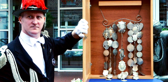 Die Ausstellung des Kiliansilbers ist in den Fenster des Bankinstitutes auf der Mittelstraße bis zum 14.7. zu sehen. Die Begeisterung der Anwesenden war bei dem Blick auf die kostbaren Stücke zu spüren, denn die Ketten werden ansonsten unter Verschluss gehalten. Besonders interessant ist natürlich die historische Kette, die Aufschluss über das Schützenwesen in den vergangenen Jahrhunderten gibt.