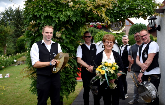 So ganz wollen die älteren Herrschaften die Feiertage nicht an sich vorbeiziehen lassen, hatten sie sich doch auf das Fest mit ihrer Goldkönigin besonders gefreut. Ludgera Krass sollte merken, dass das ein besonderes Wochenende ist. Sie bestellten am Samstagvormittag die Trommler und brachten der Goldkönigin, die mit ihrem Mann ebenfalls zu dem Freundeskreis gehört, ein Ständchen und überreichten einen Blumenstrauß. Für Ludgera Krass war das eine echte Überraschung- klar dass sie sich sehr freute.